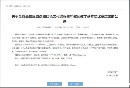 一、我校思政课教师徐小年在全省高校思政课和红色文化课程青年教师教学基本功比赛中获三等奖。